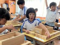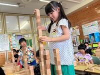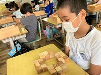 本日の朝の活動は、1年生から3年生が、飫肥杉積み木「日南キューブ」を活用した活動をしています。