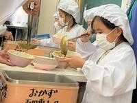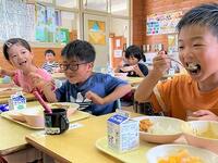 本日から1年生が、自分たちで給食の配膳を始めました。メニューは「カレー、フルーツポンチ」です。