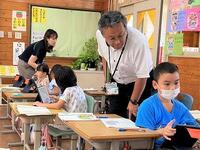 本日の朝の活動では、4年生が「キャリアパスポート」に1学期の振り返りを記録しています。1年生の国語では、「えにっき」の書き方を学んでいます。5年生の外国語科では、「テスト」に集中しています。
