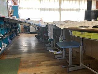 下の写真は、わかりづらいですが、教室全体を迷路にしている様子です。