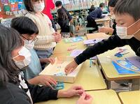 本日の3年生の外国語活動です。グリーティングカードを作るのに必要なシールなどを、英語でやりとりしながら集めていきました。
