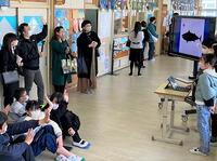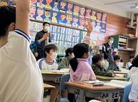 本日の5年生の「外国語」の学習です。4年生は「外国語活動」の学習です。ALTと一緒にやりとりをしています。