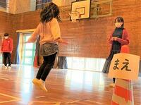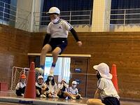 本日の2年生の体育です。運動場では、よい動きのポイントを確かめながら、ボール蹴りゲームを行っています。体育館では、片足で踏み切るポイントを確かめながら、跳の運動遊びを行っています。