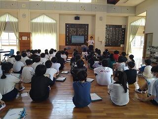 写真は、5年生の児童が図書司書の先生の読み聞かせを聞いている様子です。