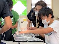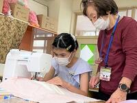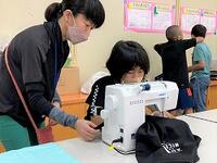 本日の5年生の家庭科では、学校支援ボランティアの皆さんからも教わりながら、エプロンを完成させています。