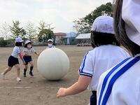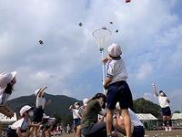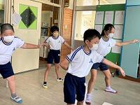 本日の1年生の体育です。運動会の団技「玉入れ」の練習です。途中で音楽が流れ、ダンスもします。