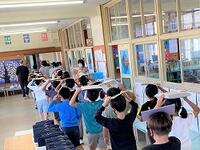 本日は、地震を想定した「避難訓練」です。3年生の教室では、DVDを視聴して、担任の先生から、身の守り方や避難の仕方などを学んでいます。
