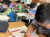 本日の5年生です。国語では、説明文の筆者が伝えたいことをまとめています。算数では、表を使って比例の問題を解いています。