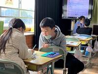 本日の5年生の国語では、手塚治虫の人物像を話し合っています。算数では、速さの問題に取り組んでいます。お昼休みの体育館では、1年生が「なわとび検定」にチャレンジしています。検定員は、体育委員会の子どもたちです。