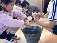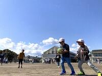 本日の2年生の算数では、1年間の学習のまとめです。長さ、かさ、時間の確認をしています。また、1年生の体育では、ボール投げゲームに取り組んでいます。