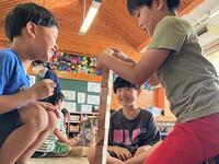 本日の朝の活動は、1年生から3年生が、飫肥杉積み木「日南キューブ」を活用した活動をしています。