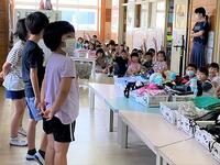 本日の6年生の外国語では、夏休みの出来事をたずね合っています。4年生の外国語活動では、文房具の名前を学んでいます。