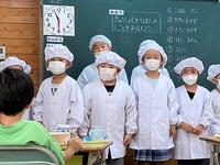 本日から1年生が、自分たちで給食の配膳を始めました。メニューは「カレー、フルーツポンチ」です。
