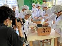 本日の給食では、日南市で育てられた早期米が出されました。地元の「新米」のおいしさを味わっています。日南市広報課の取材もありました。