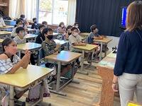 本日は、地震を想定した「避難訓練」です。3年生の教室では、DVDを視聴して、担任の先生から、身の守り方や避難の仕方などを学んでいます。