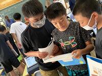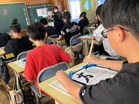 本日の6年生の社会や算数では、自分が調べて考えたことをお友達と交流しています。また、国語では、点画のつながりを考えながら習字をしています。