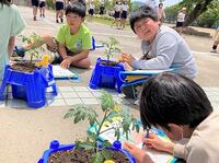 本日の2年生の生活科です。先日自分たちで植えた「ミニトマト」の観察です。また、空には、まっすぐな虹が現れました。この現象は、「環水平アーク」と呼ばれるもので、子ども達は、それもしっかりと記録していました。