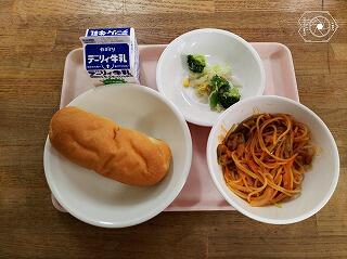 今日の献立はミニ米粉パン、ナポリタンスパゲティ、ツナサラダでした。