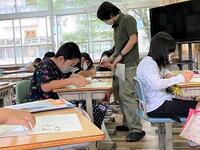 本日の5年生の算数では、学びのたしかめとして、1学期の復習問題に取り組んでいます。体育では、泳力調査をとおして、泳ぎのたしかめをしています。