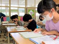 本日の5年生です。家庭科では、ソーイングのはじめとして「なみぬい」に挑戦です。社会科では、テストに集中です。