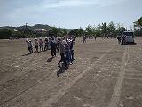 グループになって、みんなで協力して立ち上がる運動をしていました。