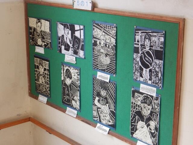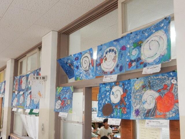1年生教室前のろうかに、子ども達の絵の作品が展示してあります。