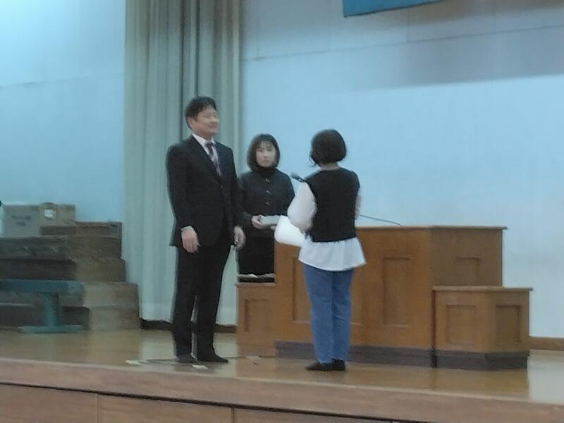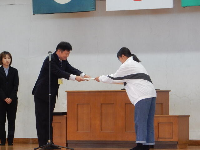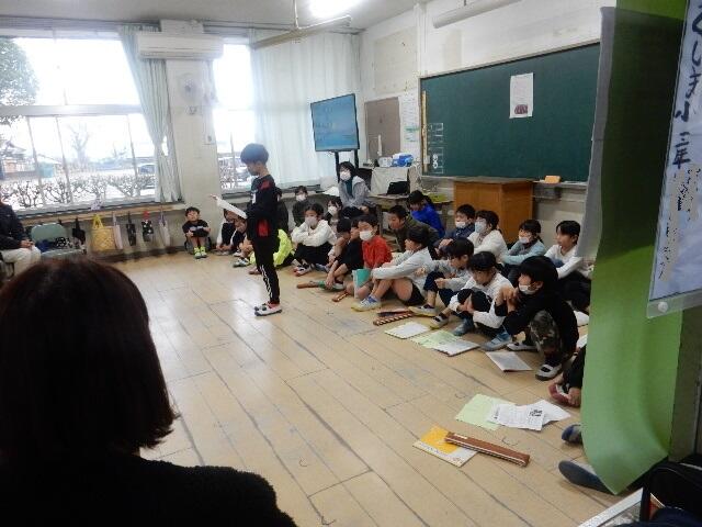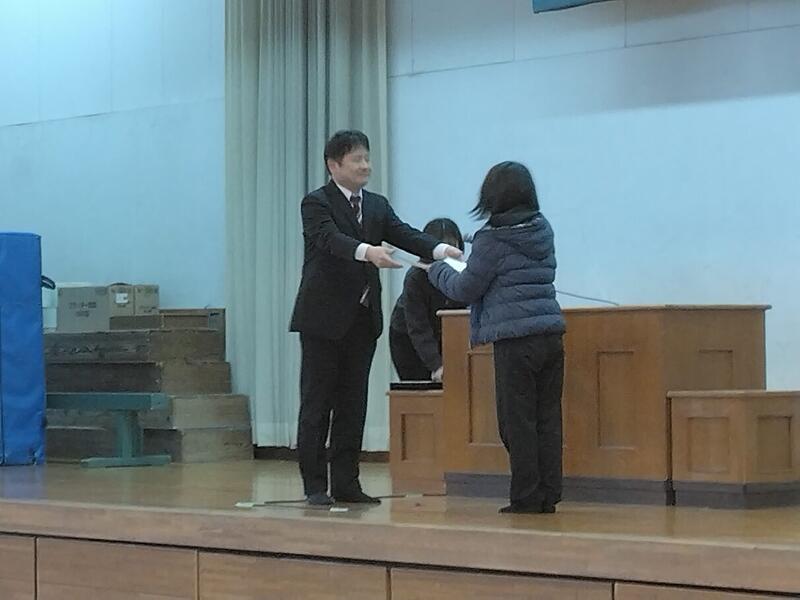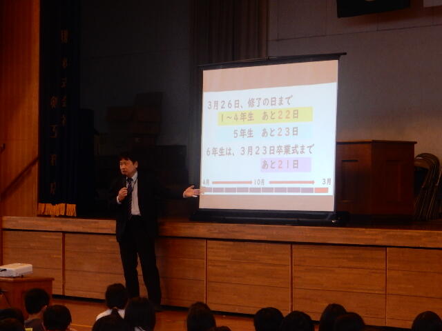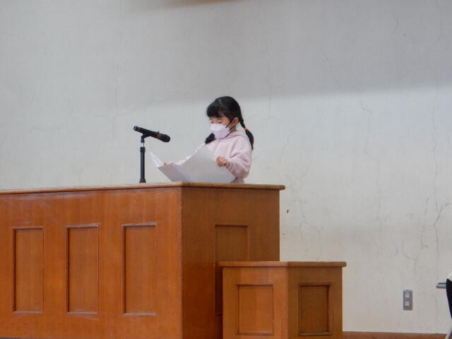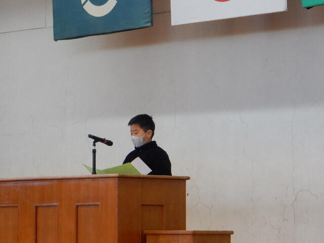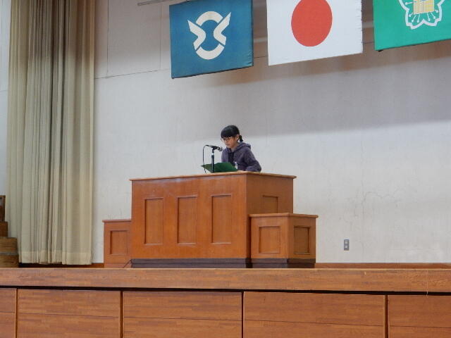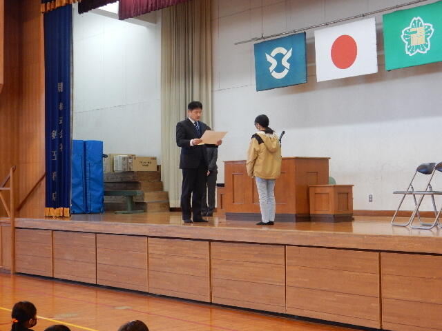 校長の話、修了証の授与(各学年代表児童)、2年生と5年生の代表児童の作文発表(校歌斉唱はインフルエンザの流行のためカット)という内容でした。