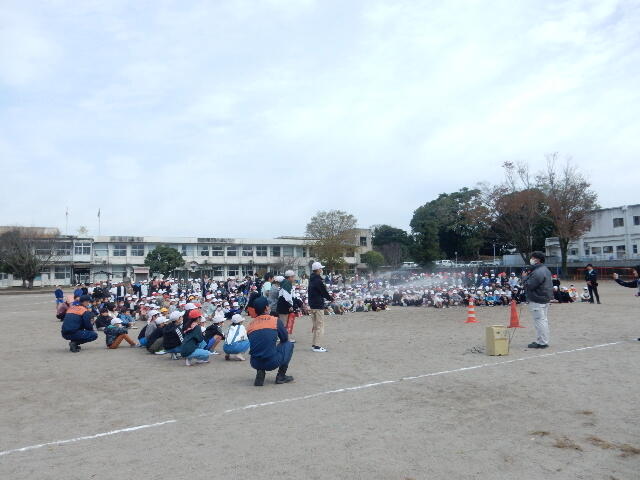 各教室から避難場所である運動場への避難後は、串間市消防署の方のお話を聴いたり、代表児童による消火器の使い方の体験をしたりしました。