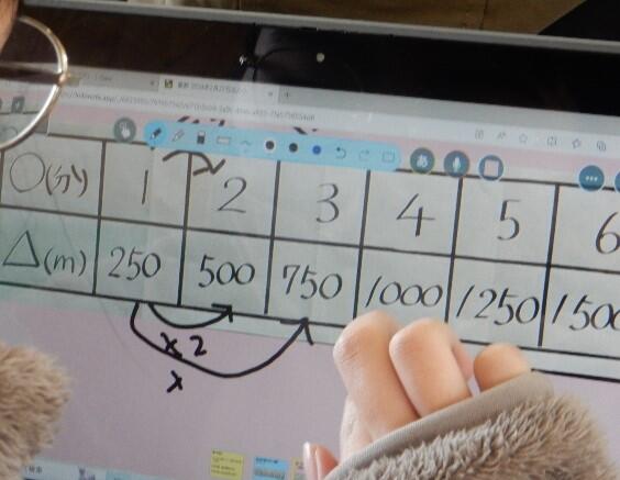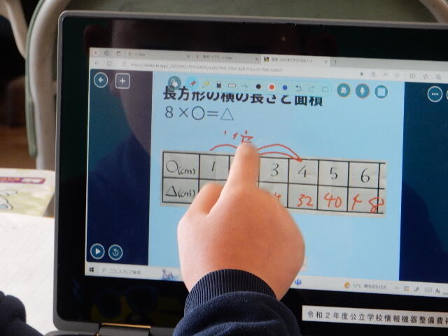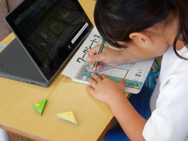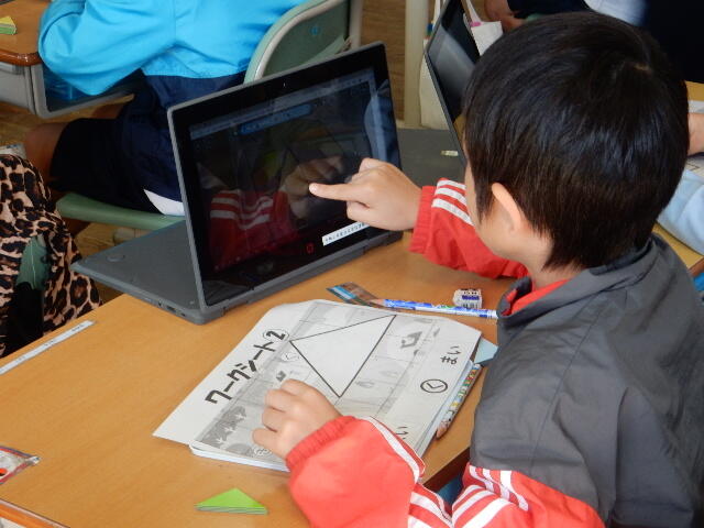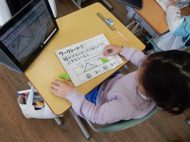 担任の先生は、さらにそこに、一人一台のタブレット端末を活動に取り入れていました。学習問題に対して、色板を使って試行錯誤しながら導き出した答えを、タブレット端末で自分で撮影し、その画像をもとにワークシートに解答を書き込んでいく活動でした。