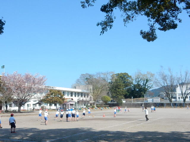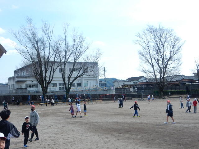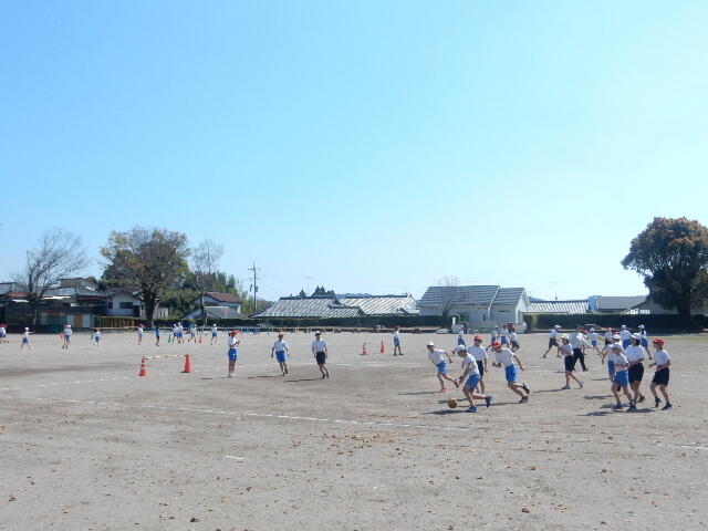 午後、6年生の子ども達が運動場で体育。今日の日中は半袖でも過ごせるくらい暖かくなりました。校庭の山桜は、春風で桜吹雪が舞い、少しずつ葉桜になっています。