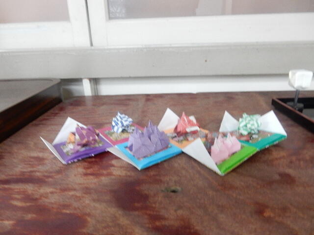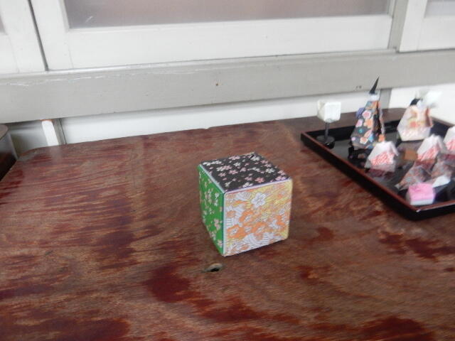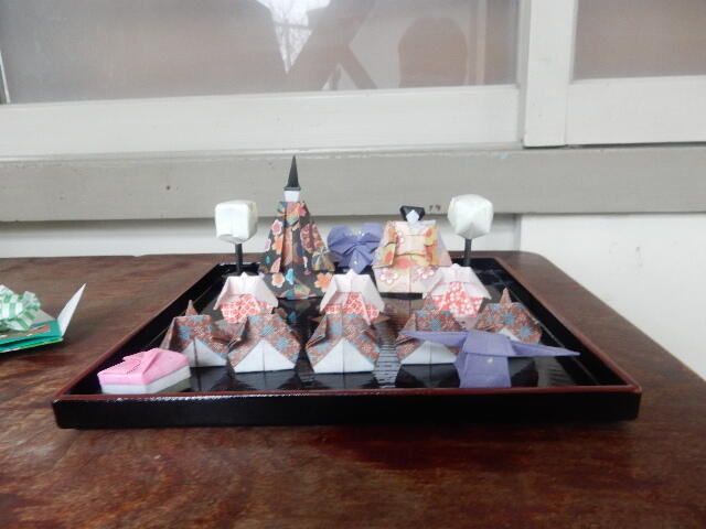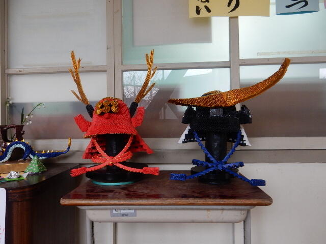 校長室前のろうかに、折り紙で作られた兜が飾ってあります。