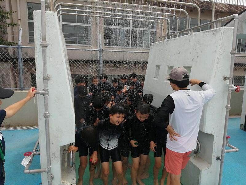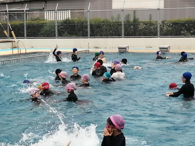 今日は、一足先に4年生のプール開きが行われました。                                                               まず事前に教室で安全指導を行った後、プールに移動をしました。            プールに着いたら、笛の合図等の確認をしました。                                                               そしていよいよシャワーを浴びます。今日は、天気は薄曇りでしたが水の冷たさに子どもたちの声がプールに響きました。                                                                                   いよいよ入水です。水の中にもぐったり、友達とじゃんけんをしたりをしてだんだん水に慣れていきました。自由時間では、思い思いにいろいろな水遊びをする子どもたちの声がプールいっぱいに広がりました。                                                      明日は、天気が心配ですが4年生以外のプール開きです。