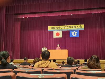 14日(土)、串間市文化会館にて本年度の串間市青少年の声を聞く会が行われました。市内の全ての小学校、串間中、福島高校の代表に選出された子ども達が、それぞれに自分の思いを堂々と表現し合う充実の時間でした。