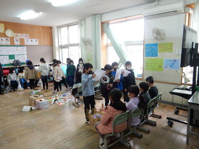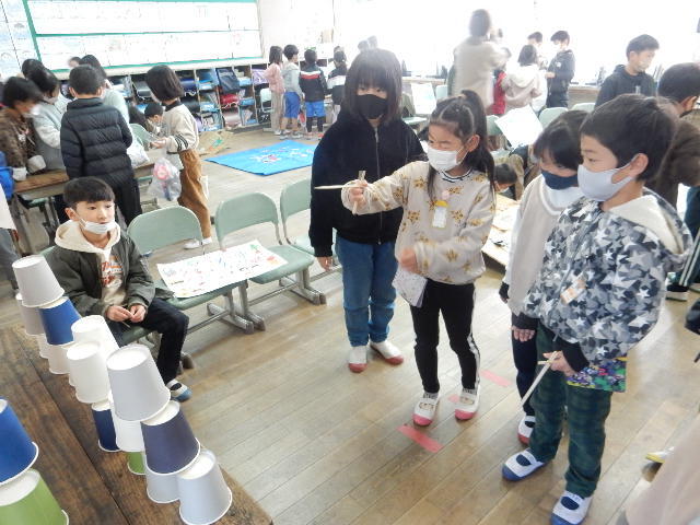 2校時と3校時、2年生の4つの教室では、生活科の学習「おもちゃまつり」でした。このおもちゃまつりは、2年生の皆さんが1年生のお友達を各クラスに招待して、これまでに準備を進めてきた手作りおもちゃのコーナーで、1年生に楽しんでもらおうという企画です。