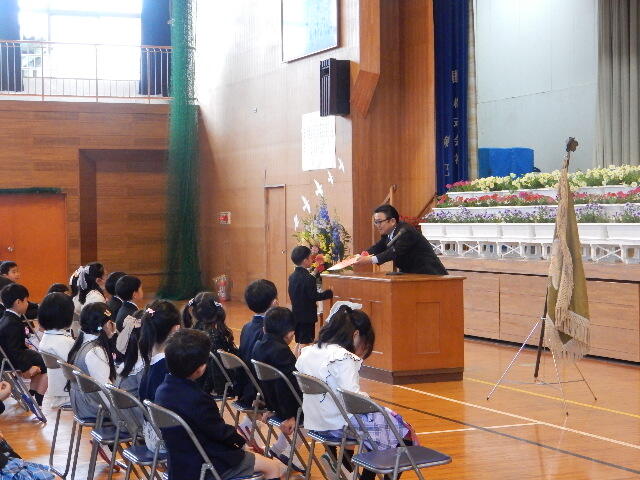 昨日は、本校伝統の福島小交通少年団の結団式を行いました。本年度の団員は、総数21名。子ども達は、まず、生徒指導主事の先生からの氏名点呼を受け、その後、代表児童が串間市役所の方から団員証を受け取りました。
