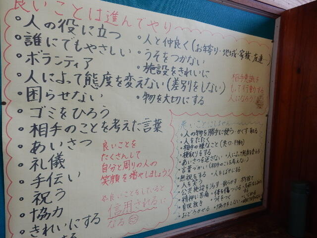 生活に関する子ども達との約束の1つが、「良いことは進んでやり、悪いことはしない」です。6年生の教室には、この約束について子ども達が考えた具体的な目指す姿が、掲示されていました。