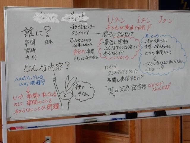 今日のくしま学の活動は、串間の魅力を、今後「誰に」「どのような内容」を情報発信すればよいかを考えることです。そのために、串間市への移住に関するお仕事をされている代表の方を講師として学校にお呼びし、お話を聴かせていただきました。