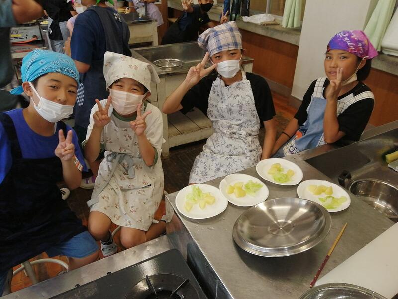 今日は5年生の調理実習が行われました。暑い家庭科室の中での火を使った実習ですので子どもたちは随時給水をしたり、扇風機、クーラーのある教室で涼んだりしながら学習を進めました。                 今回は、「温野菜サラダ」をつくりました。使う野菜はジャガイモとキャベツです。ゆでながら、芯がないかを確かめていきました。その間、子どもたちは鍋と向き合いながらゆであがるのをじっと見ていました。野菜がゆであがってある程度冷ましたらドレッシング作りです。今回は和風と中華風のドレッシングを自分たちで作りました。出来上がった温野菜のサラダ、みんな笑顔で食べていました。