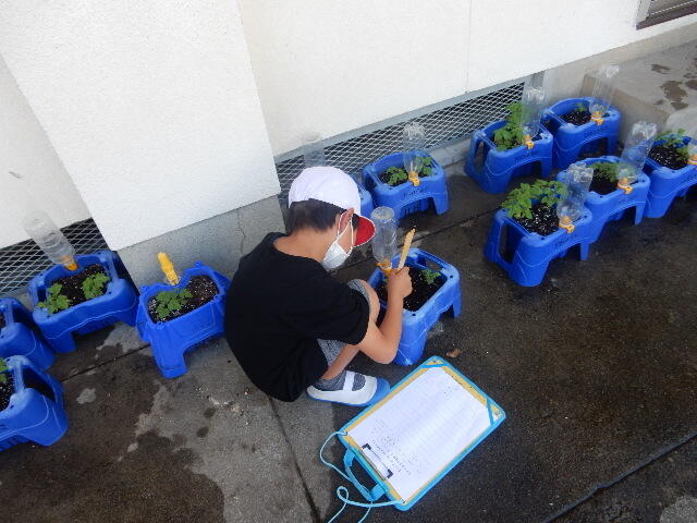 台風の影響なのか、今日は真夏を思わせるとても蒸し暑い1日です。2年生は今、生活科でミニトマトを育てていて、今朝は、生活科の時間に成長の様子を調べる姿が見られました。
