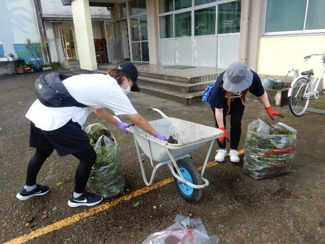 写真は、1学期末7月20日のものです。気温と湿度が高い中、環境整備員さんは黙々と除草作業。