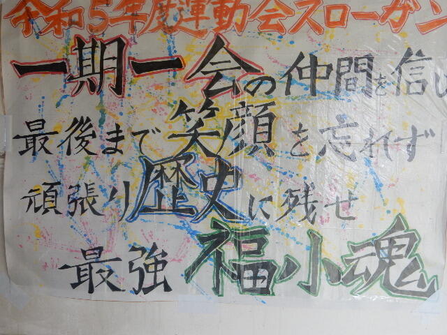 これから1か月間、福小全体が運動会当日に向けて、赤団、白団、青団の3つの団で互いに競い合い、高め合うそういう期間になることを期待しています。福小の皆さん、スローガンにあるとおり、福小魂を胸に、全員一丸となってがんばりましょう!