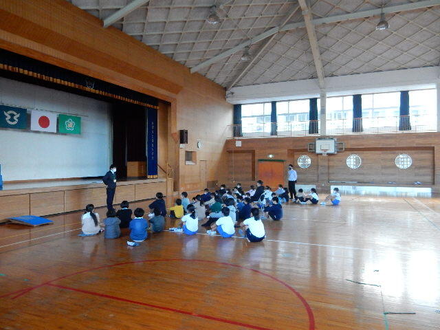 写真は、体育館の様子です。3つの地区が分かれてそれぞれの担当の先生のお話を聴きました。また、各教室でも集会を行いました。