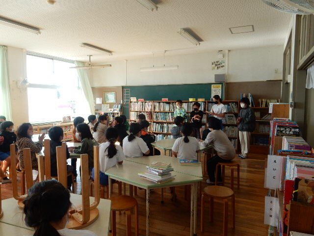 昨日に引き続き、今日の昼休みも読書祭りということで、高学年の子ども達が図書室で3年生の子ども達を相手に「本探し」の企画を実行していました。いつも使っている図書室が、この時間は、少し違った空間になりましたね。
