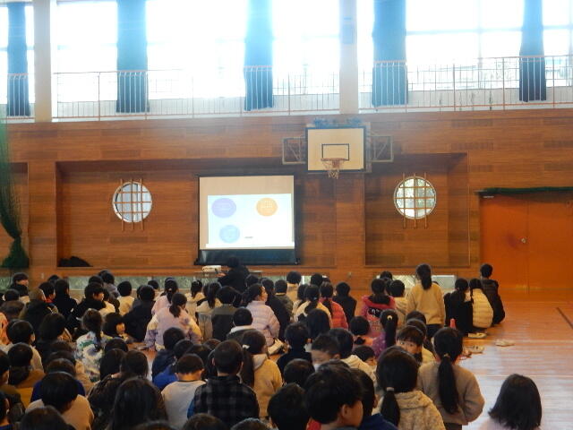 体育館の皆さんで6年生が作成した紹介動画を視聴しました。