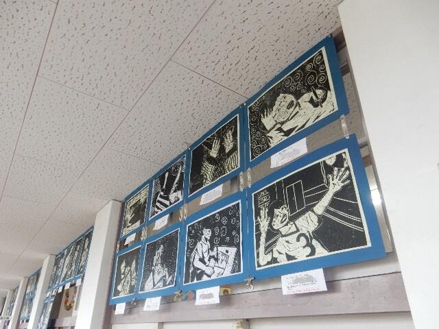 6年生教室前のろうかには、ご覧のような版画作品が掲示してあります。どの作品も主題がはっきりとしていて、時間をかけて仕上げた作品だけに、見ていて楽しくなってきます。