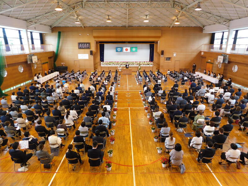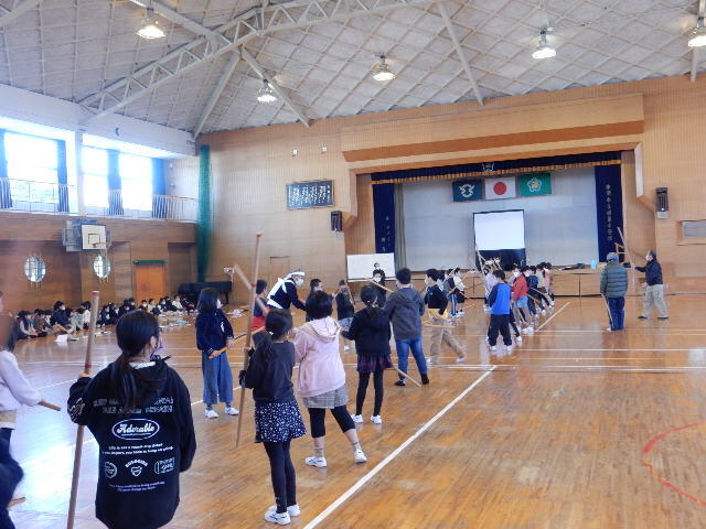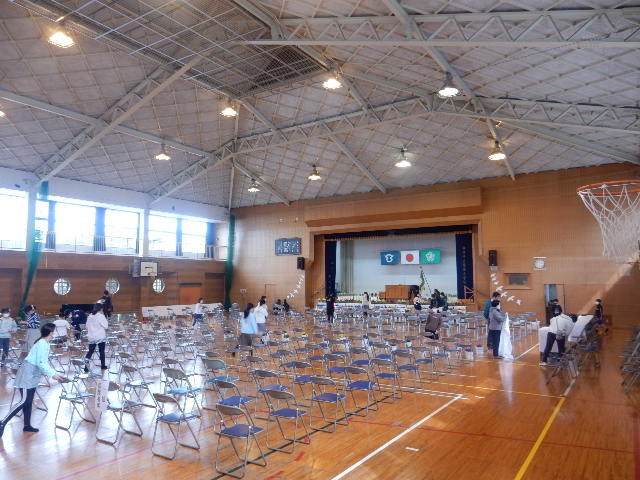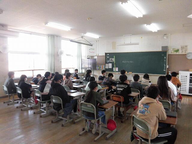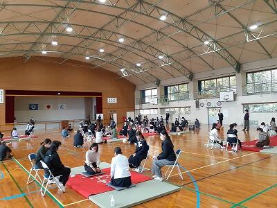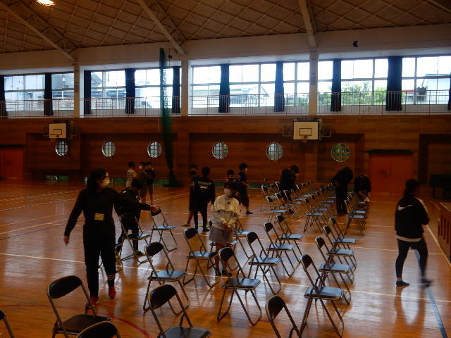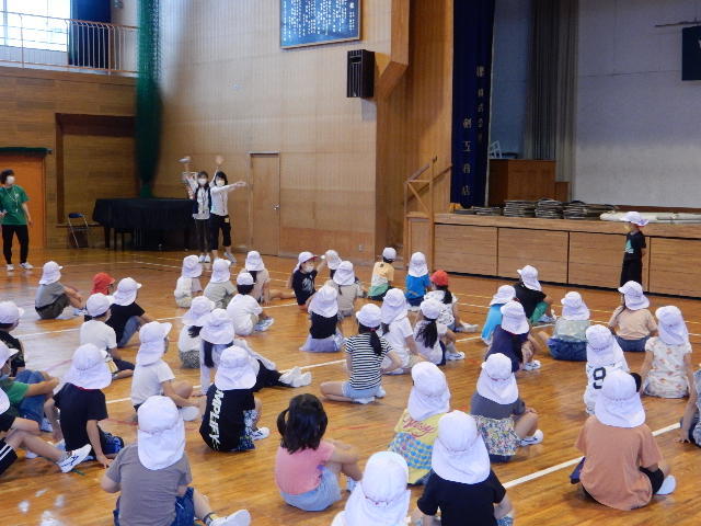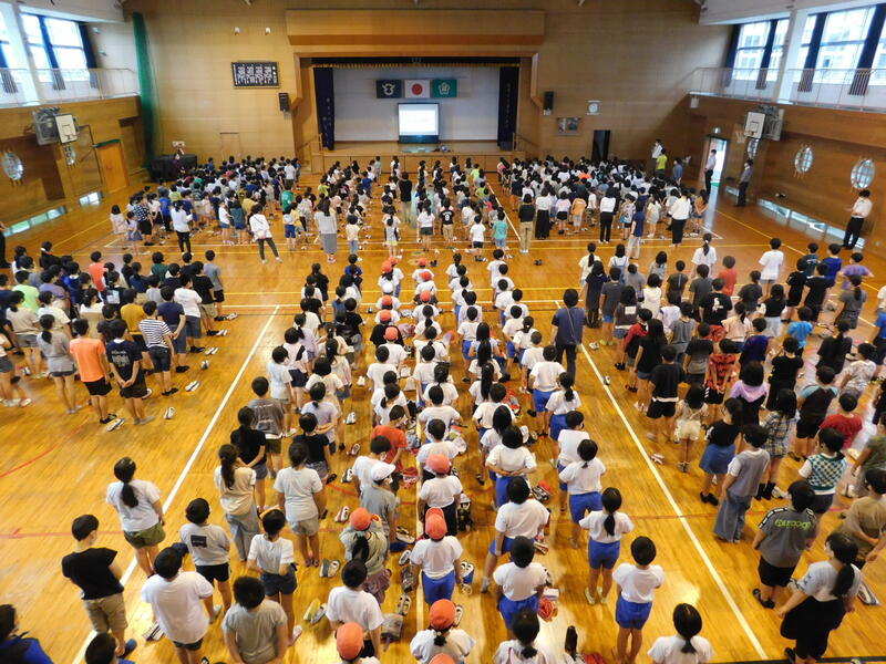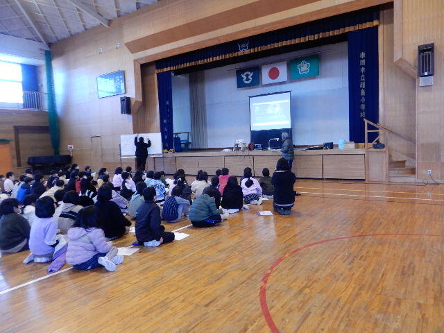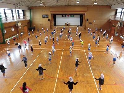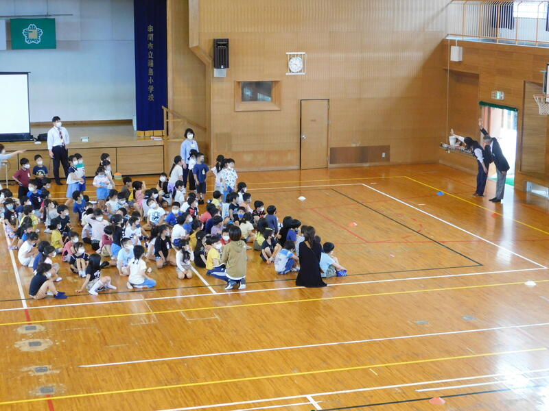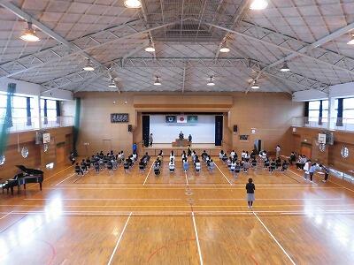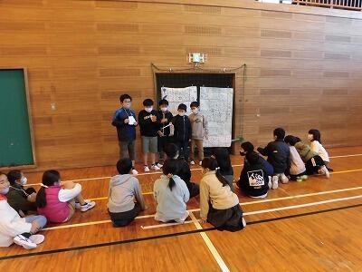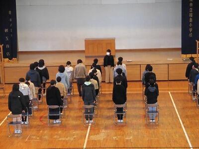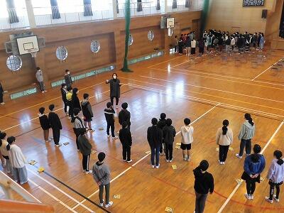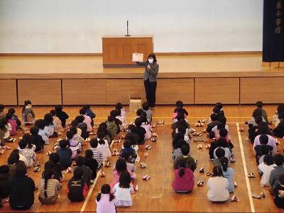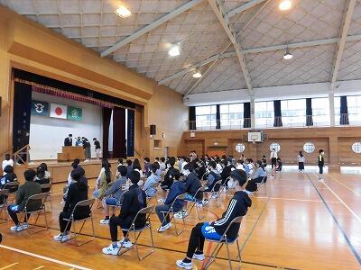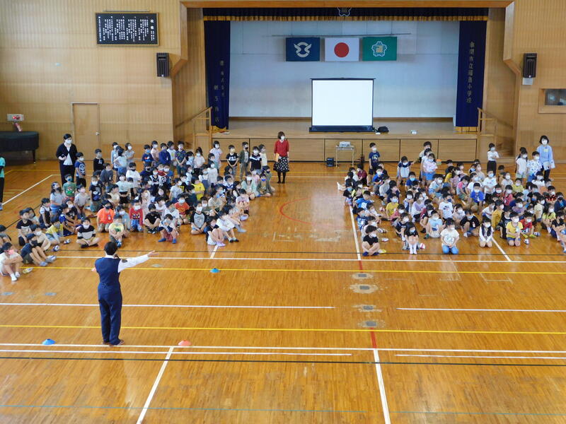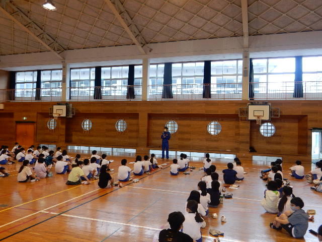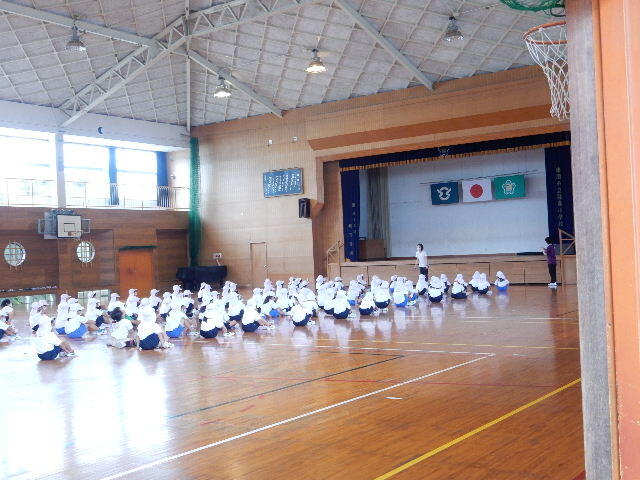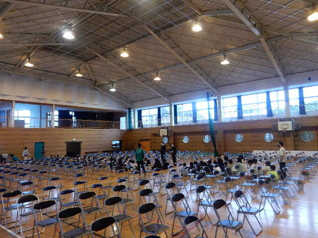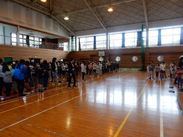 昨年度まで朝の時間に行っていた集会活動は、本年度から昼休み時間の後に行うことになりました。コロナ感染が比較的落ち着いてきたので、久しぶりに体育館にて対策をとって行いました。