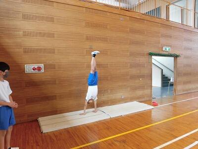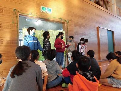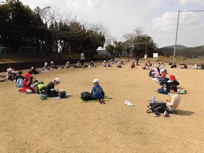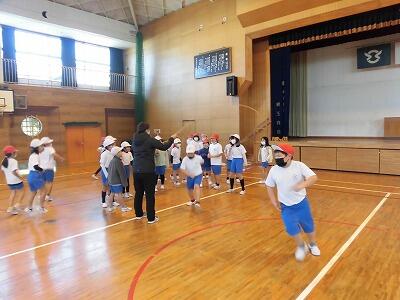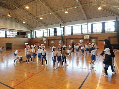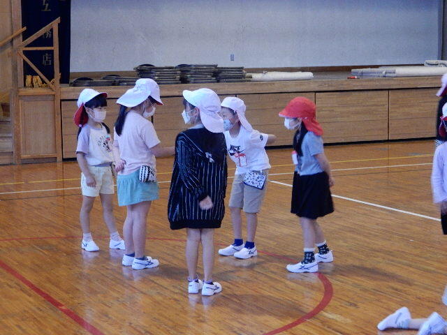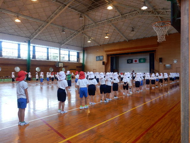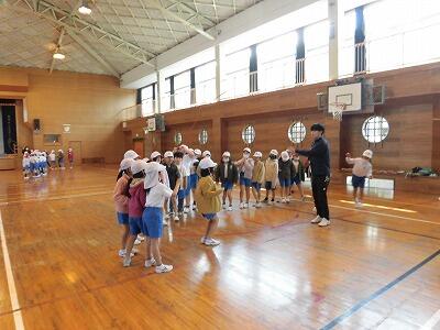 高学年のような静かな態度で話に集中している後ろ姿、頼もしいかぎりです。先生の指示をよく聴いて、集団で規律正しく行動する行動の仕方を先生から学んでいました。このことは、体育の時間での大切な学習技能であることはもちろんですが、「いざ」という時(災害時など)に、自分の身を守る行動につながる大切な学習です。