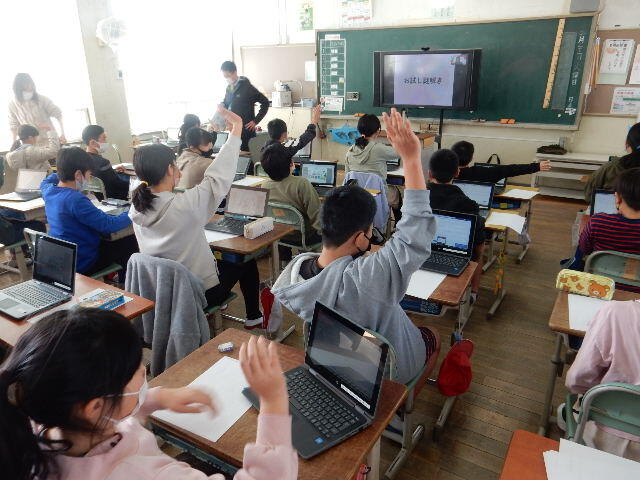 6年生の社会科の時間。互いの顔が見える座席配置で学習しています。先生からの問いに、近くの友達と話し合っている子ども達。