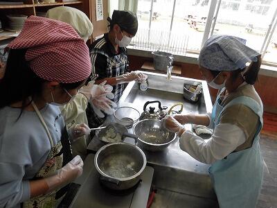 6年生が調理実習をしています。身近な食品を使って、グループで調理計画を立て、実習に取り組んでいました。
