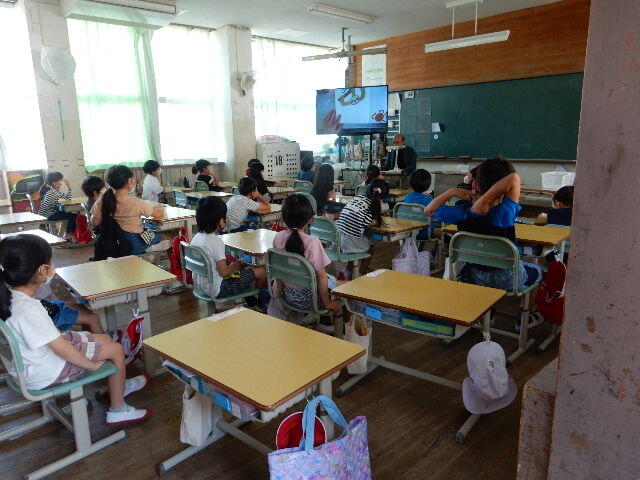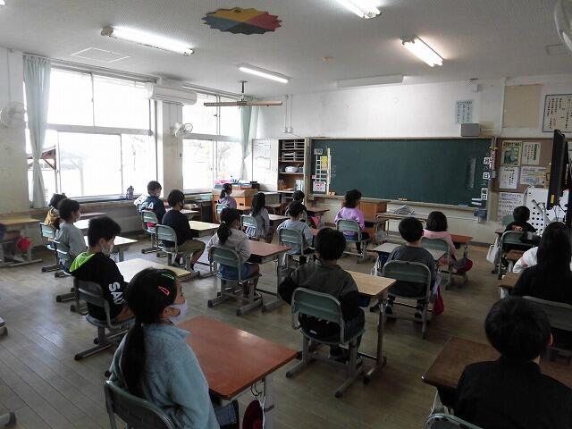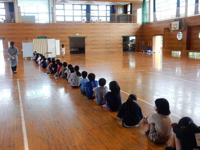 3時間目のこと。「静かだな」と思いながら、体育館の様子を見てみると、そこには体育の時の座り方で、先生の方を見て、お話に集中している子どもの姿が・・・。よく見ると、何とそれは1年生!